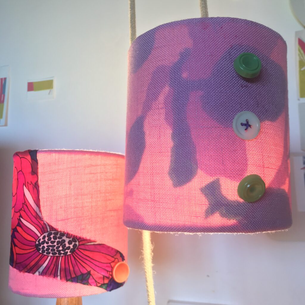 The lampshades combine vibrant colour contrast, subtle texture and fragments of text and poetry in Cymraeg. The designs have grown out of observation, drawing and writing in the landscape in different seasons and weathers.